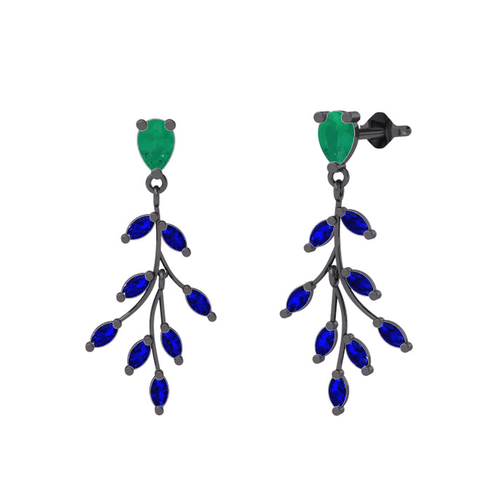 Kök zümrüt ve lab safir 925 ayar siyah rodyum kaplama gümüş küpe