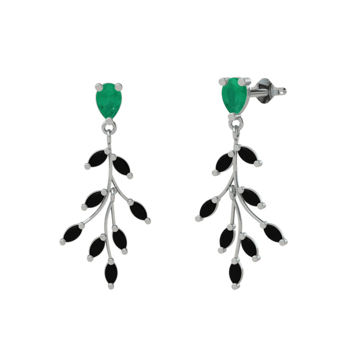 Kök zümrüt ve siyah zirkon 14 ayar beyaz altın küpe