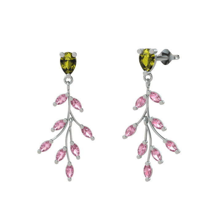 Peridot ve pembe kuvars 8 ayar beyaz altın küpe