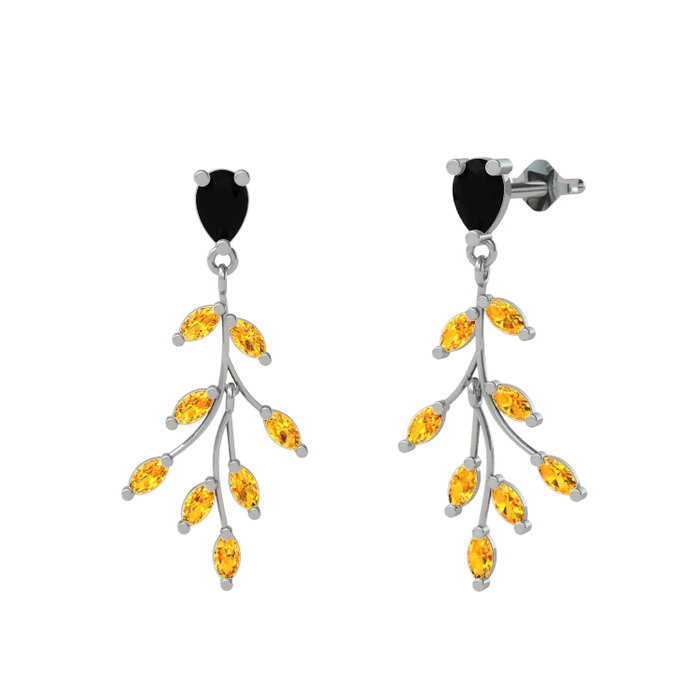 Siyah zirkon ve sitrin 14 ayar beyaz altın küpe