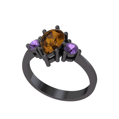 Dumanlı kuvars ve ametist 925 ayar siyah rodyum kaplama gümüş yüzük