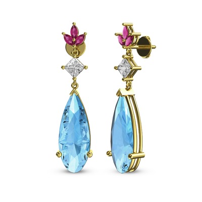 Akuamarin, beyaz zirkon ve rodolit garnet 8 ayar altın küpe