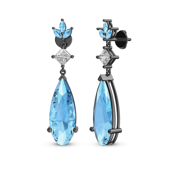 Akuamarin ve beyaz zirkon 925 ayar siyah rodyum kaplama gümüş küpe