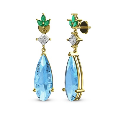 Akuamarin, swarovski ve yeşil kuvars 14 ayar altın küpe