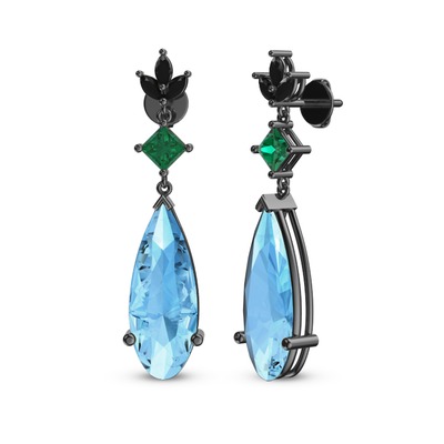 Akuamarin, yeşil kuvars ve siyah zirkon 925 ayar siyah rodyum kaplama gümüş küpe