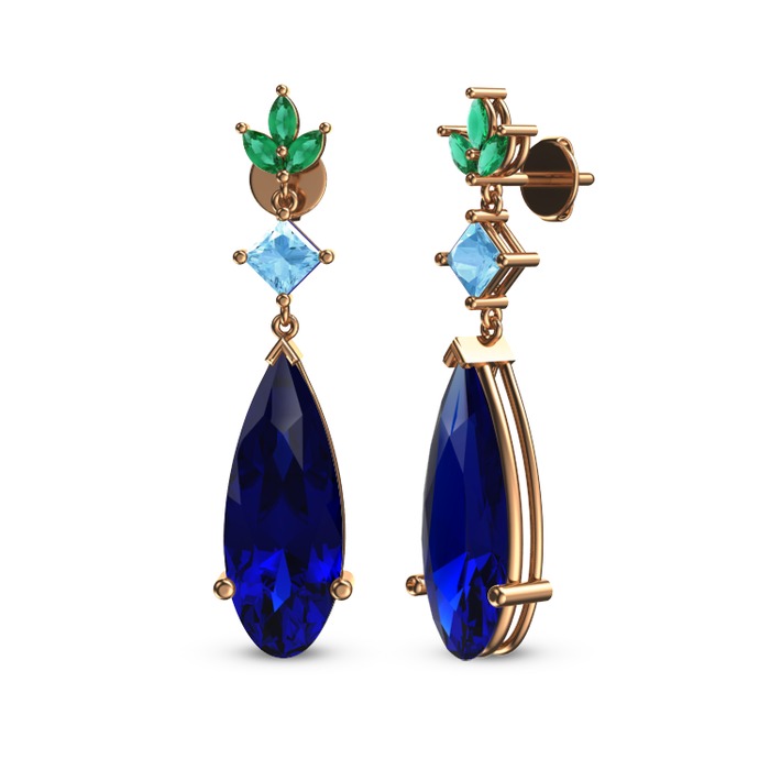Lab safir, akuamarin ve yeşil kuvars 18 ayar rose altın küpe