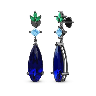Lab safir, akuamarin ve yeşil kuvars 925 ayar siyah rodyum kaplama gümüş küpe
