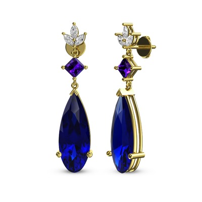Lab safir, ametist ve beyaz zirkon 925 ayar altın kaplama gümüş küpe
