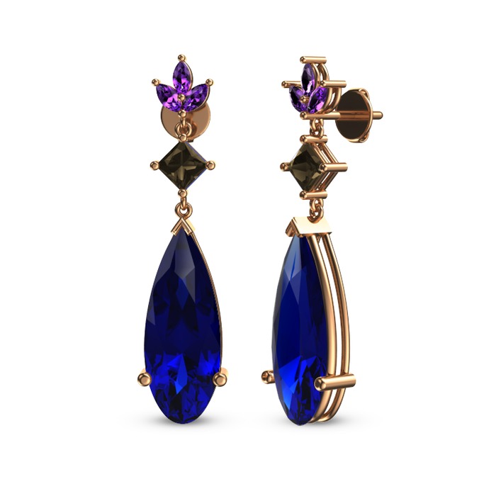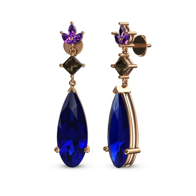 Lab safir, dumanlı kuvars ve ametist 18 ayar rose altın küpe