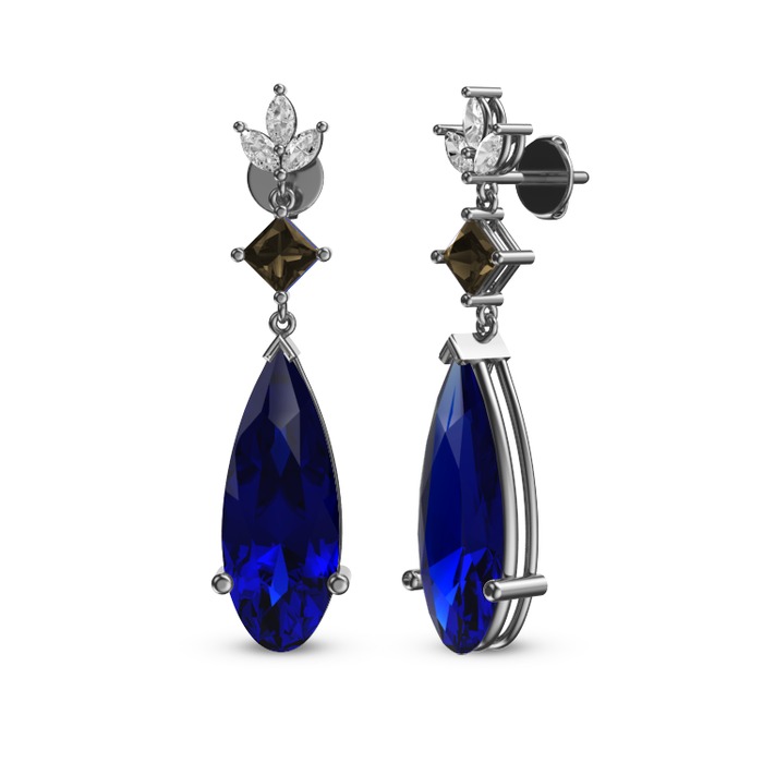 Lab safir, dumanlı kuvars ve beyaz zirkon 18 ayar beyaz altın küpe