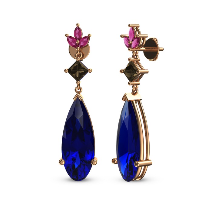 Lab safir, dumanlı kuvars ve rodolit garnet 925 ayar rose altın kaplama gümüş küpe