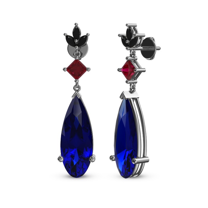 Lab safir, rodolit garnet ve siyah zirkon 14 ayar beyaz altın küpe