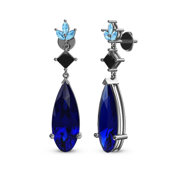 Lab safir, siyah zirkon ve akuamarin 14 ayar beyaz altın küpe