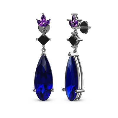Lab safir, siyah zirkon ve ametist 14 ayar beyaz altın küpe