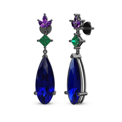 Lab safir, yeşil kuvars ve ametist 925 ayar siyah rodyum kaplama gümüş küpe