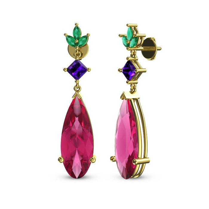 Pembe kuvars, ametist ve yeşil kuvars 14 ayar altın küpe