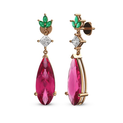Pembe kuvars, beyaz zirkon ve yeşil kuvars 14 ayar rose altın küpe