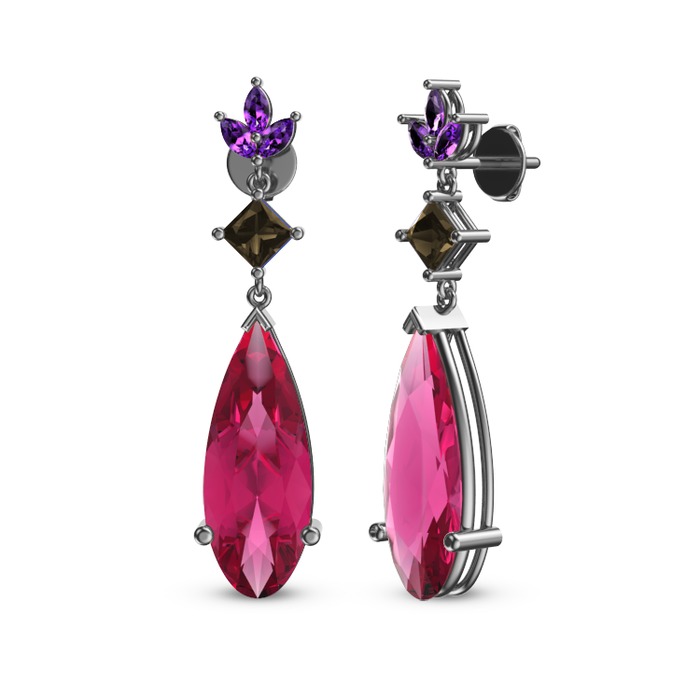 Pembe kuvars, dumanlı kuvars ve ametist 925 ayar gümüş küpe