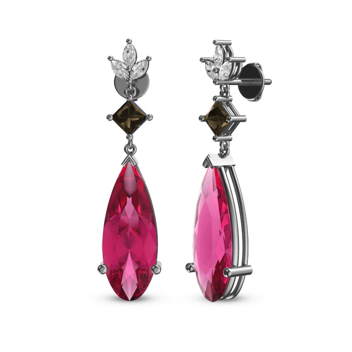 Pembe kuvars, dumanlı kuvars ve beyaz zirkon 18 ayar beyaz altın küpe