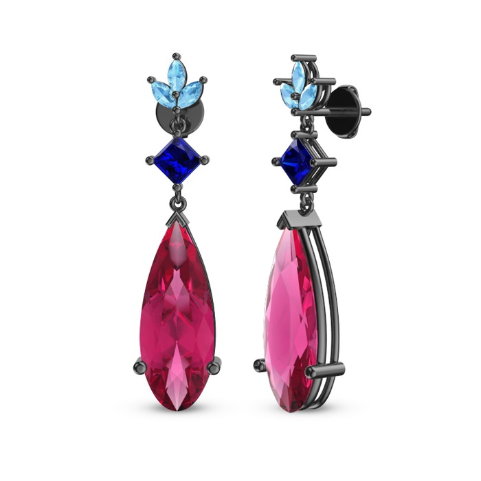 Pembe kuvars, lab safir ve akuamarin 925 ayar siyah rodyum kaplama gümüş küpe