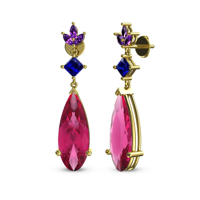 Pembe kuvars, lab safir ve ametist 18 ayar altın küpe