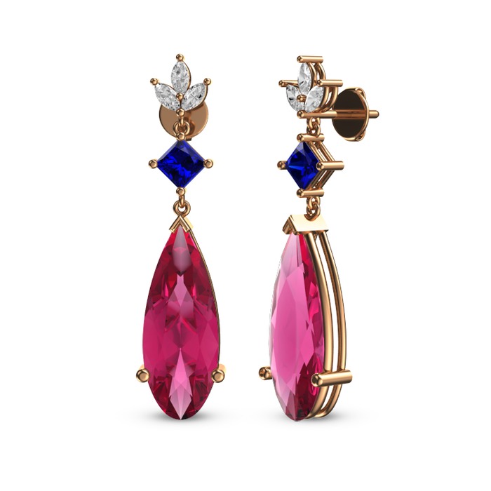 Pembe kuvars, lab safir ve beyaz zirkon 14 ayar rose altın küpe