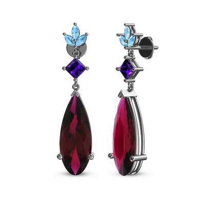 Rodolit garnet, ametist ve akuamarin 14 ayar beyaz altın küpe
