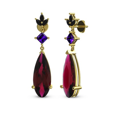 Rodolit garnet, ametist ve siyah zirkon 14 ayar altın küpe