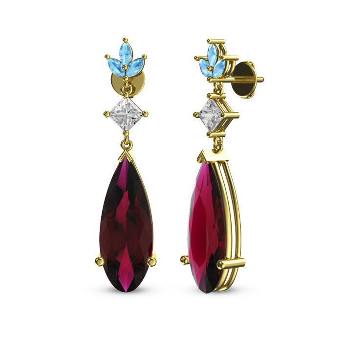 Rodolit garnet, beyaz zirkon ve akuamarin 925 ayar altın kaplama gümüş küpe