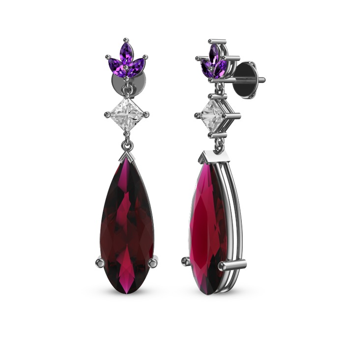 Rodolit garnet, beyaz zirkon ve ametist 14 ayar beyaz altın küpe