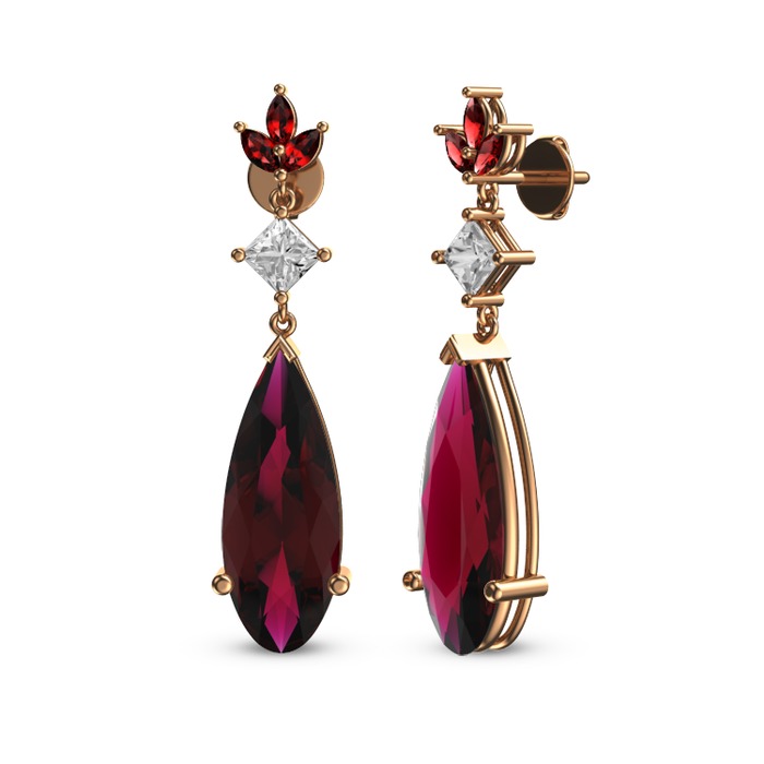 Rodolit garnet, beyaz zirkon ve garnet 8 ayar rose altın küpe
