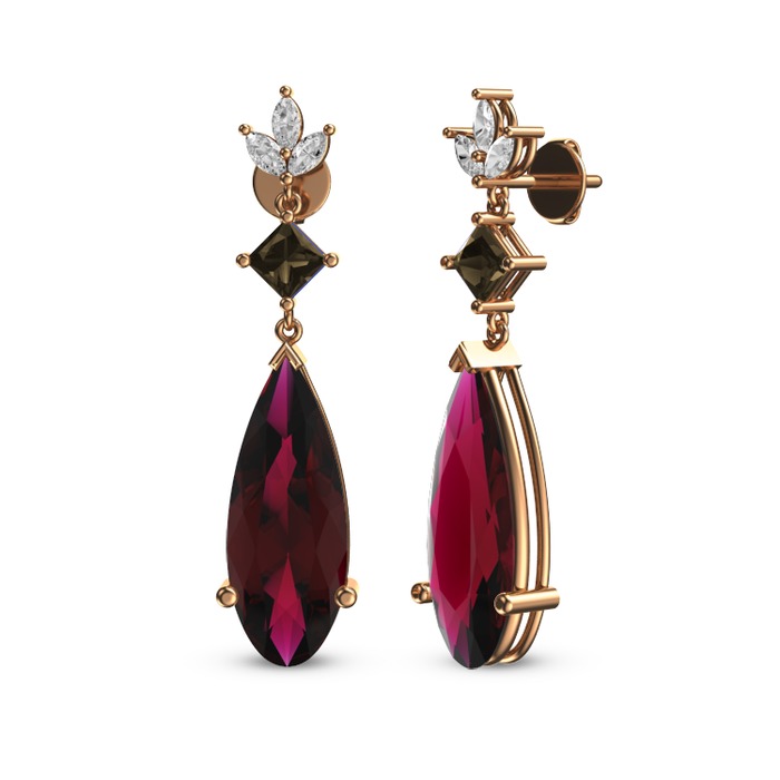 Rodolit garnet, dumanlı kuvars ve beyaz zirkon 14 ayar rose altın küpe
