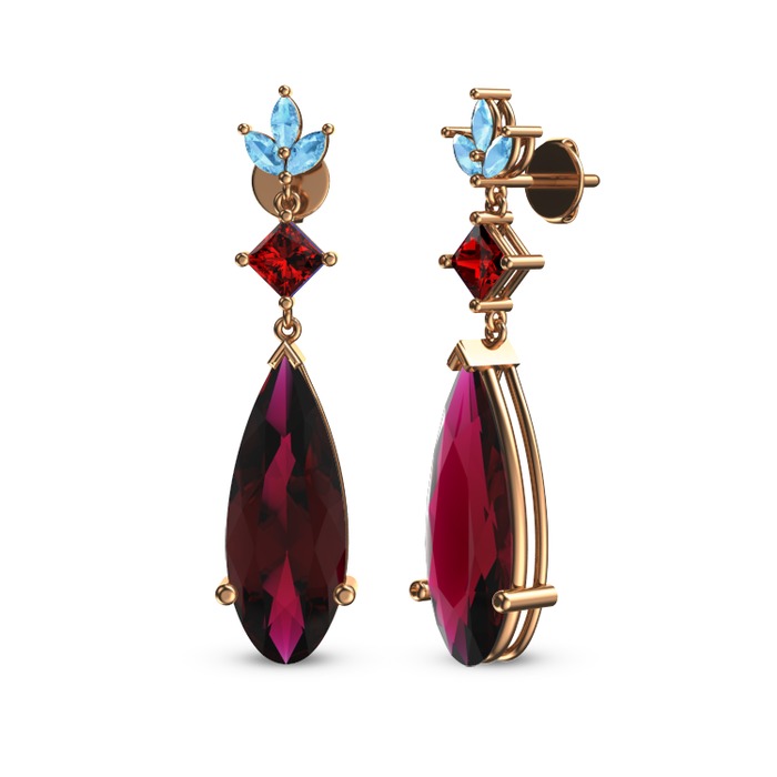 Rodolit garnet, garnet ve akuamarin 14 ayar rose altın küpe