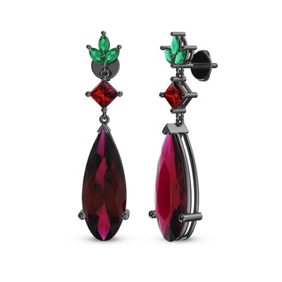 Rodolit garnet, garnet ve yeşil kuvars 925 ayar siyah rodyum kaplama gümüş küpe