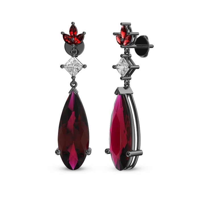 Rodolit garnet, swarovski ve garnet 925 ayar siyah rodyum kaplama gümüş küpe