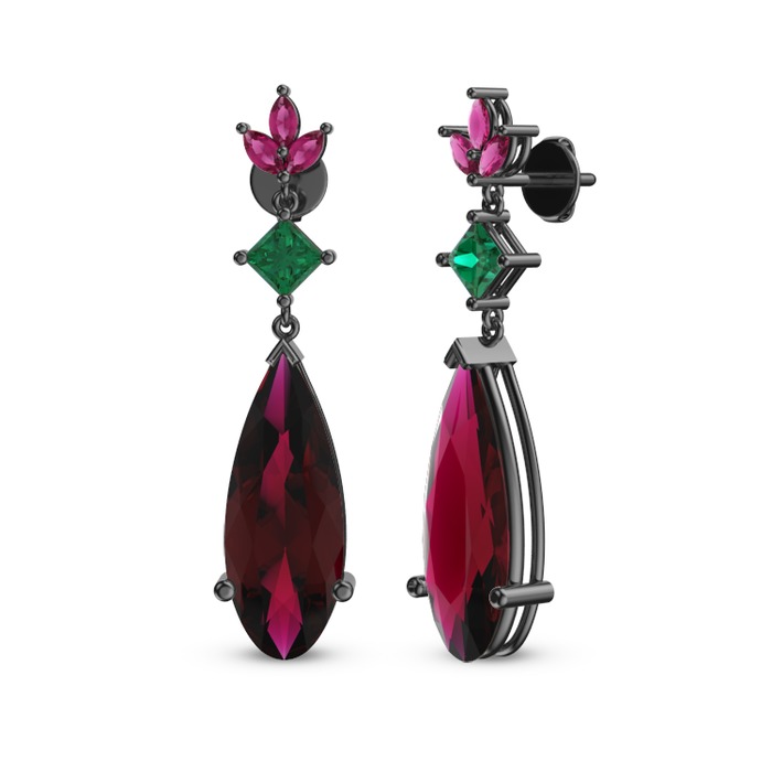 Rodolit garnet ve yeşil kuvars 925 ayar siyah rodyum kaplama gümüş küpe