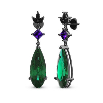 Yeşil kuvars, ametist ve siyah zirkon 925 ayar siyah rodyum kaplama gümüş küpe