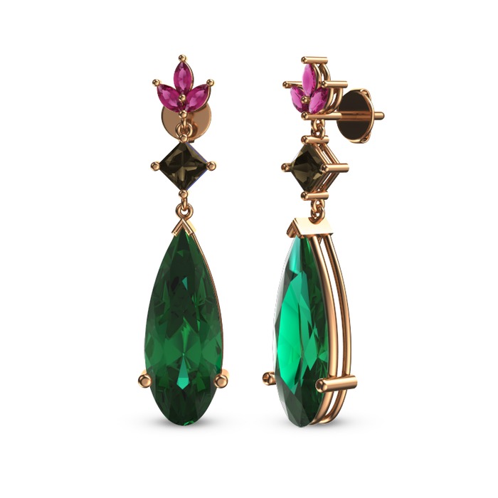 Yeşil kuvars, dumanlı kuvars ve rodolit garnet 18 ayar rose altın küpe