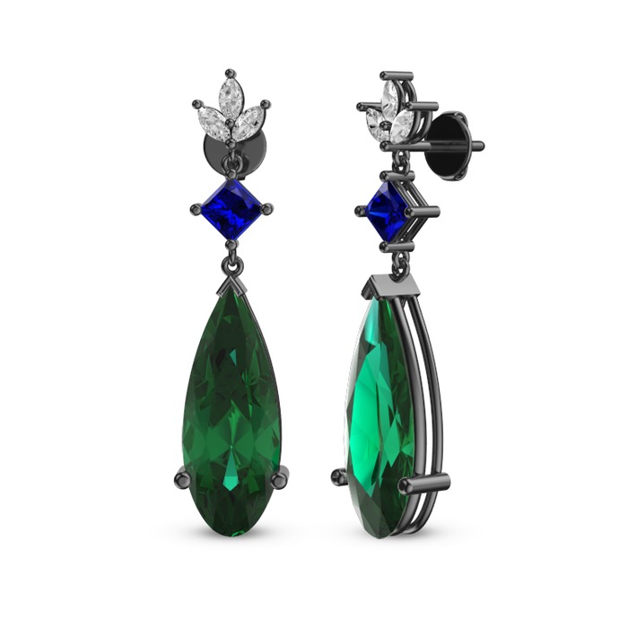 Yeşil kuvars, lab safir ve beyaz zirkon 925 ayar siyah rodyum kaplama gümüş küpe