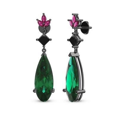 Yeşil kuvars, siyah zirkon ve rodolit garnet 925 ayar siyah rodyum kaplama gümüş küpe