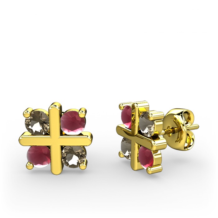 Dumanlı kuvars ve kök yakut 14 ayar altın küpe