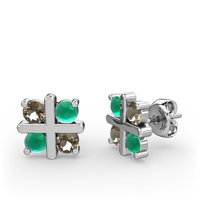 Dumanlı kuvars ve kök zümrüt 14 ayar beyaz altın küpe
