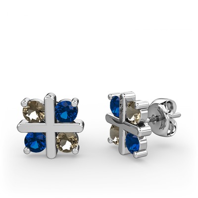 Dumanlı kuvars ve lab safir 14 ayar beyaz altın küpe
