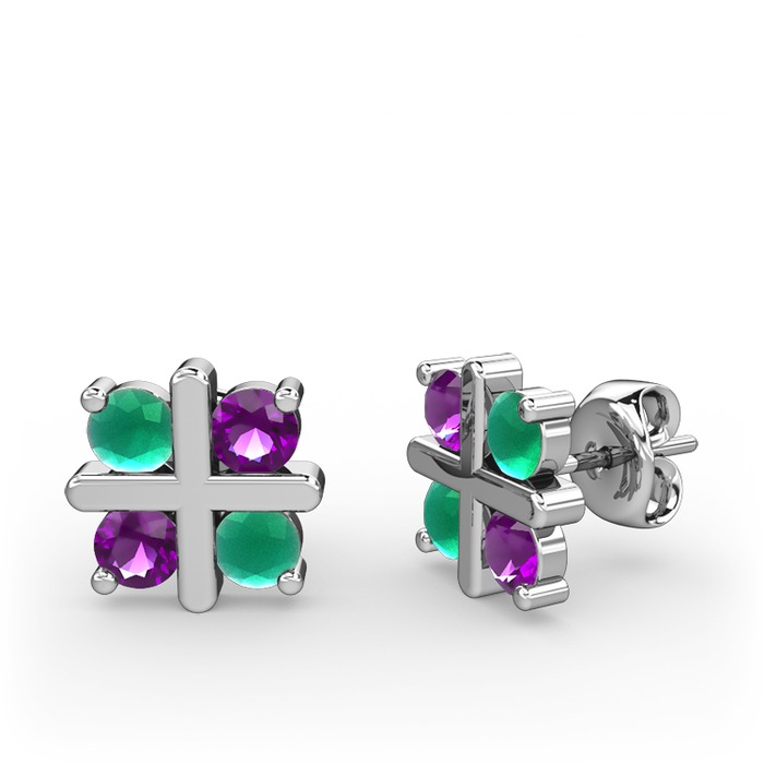 Kök zümrüt ve ametist 14 ayar beyaz altın küpe