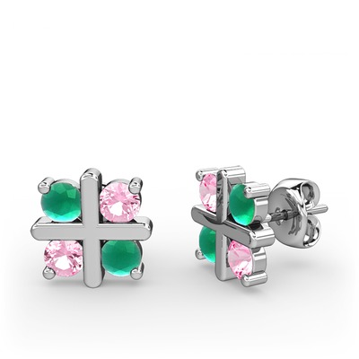 Kök zümrüt ve pembe kuvars 8 ayar beyaz altın küpe