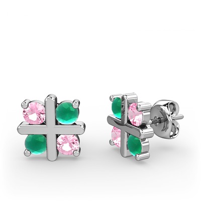Pembe kuvars ve kök zümrüt 8 ayar beyaz altın küpe