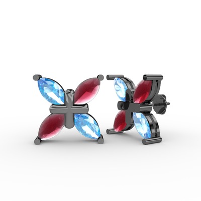 Akuamarin ve kök yakut 925 ayar siyah rodyum kaplama gümüş küpe