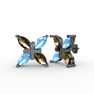 Dumanlı kuvars ve akuamarin 925 ayar siyah rodyum kaplama gümüş küpe