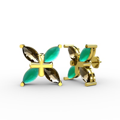 Dumanlı kuvars ve kök zümrüt 8 ayar altın küpe