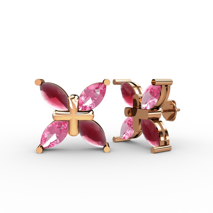 Kök yakut ve pembe kuvars 14 ayar rose altın küpe